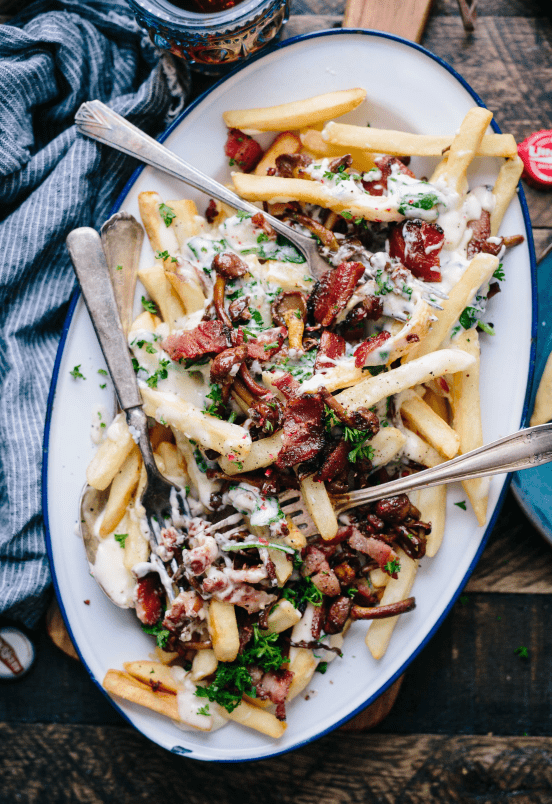 Spinach, Mushroom + Bacon Alfredo Poutine